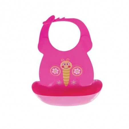 Muovinen ruokalappu, jossa irrotettava murutasku. Ruokalapun kourun voi irrottaa helposti tyhjentämistä ja pesua varten. Ruokalapussa on säädettävä, helppokäyttöinen kiinnitys lapsen kaulan ympärille.