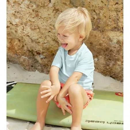 Lyhythihaisessa Lässig aurinkosuojapaidassa on 50+ UV-suoja. Paitoihin on saatavilla myös sävyihin sopivia uimavaippoja sekä aurinkosuojahattuja.