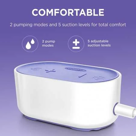 Pumppu on helppo sujauttaa laukkuun kun olet reissussa. 2-vaiheinen teknologia jäljittelee vauvan luontaista imuliikettä ja viisiportainen imutehon säätö maksimoi mukavuuden pumpatessa.