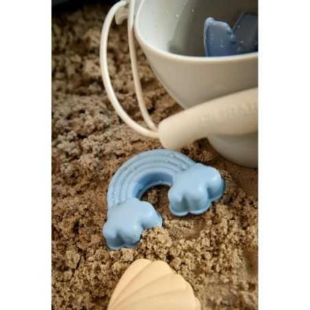 Hiekkalelusettiin kuuluu 5 söpöä hiekkamuottia, lapio, ämpäri ja kätevä kansi, joka on samalla frisbee. Muoteissa seikkailevat meritähti, sydän, sateenkaari, simpukka ja pikku kilppari. Rantalelujen silikonimateriaali on erittäin kestävää, joten Filibabba Hiekkalelusetillä lapsesi leikkii kesästä kesään.