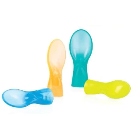 Nuby lusikan voit kiinnittää lähes kaikkiin vauvanruokapusseihin! Sinisessä paketissa kaksi eri sinisen sävyistä lusikkaa ja keltaisessa paketissa keltainen ja oranssi lusikka.